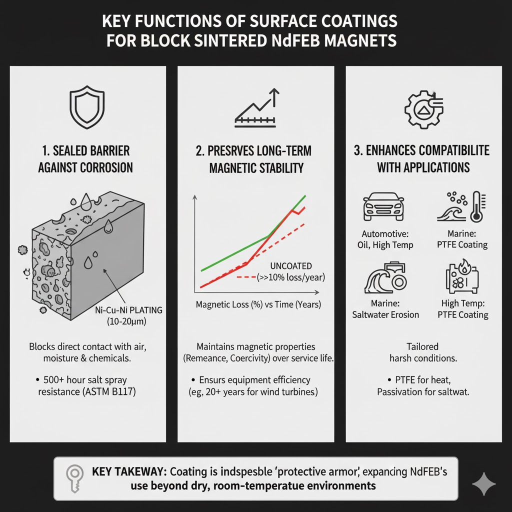 Untuk Block Sintered NdFeB, pelapisan permukaan bukan merupakan "peningkatan" opsional namun merupakan "persyaratan" mendasar untuk mewujudkan nilainya. Reaktivitas kimia yang melekat dan struktur sinter berpori membuat korosi tidak dapat dihindari tanpa perlindungan—dan korosi secara langsung menghancurkan integritas struktural dan kinerja magnetiknya.